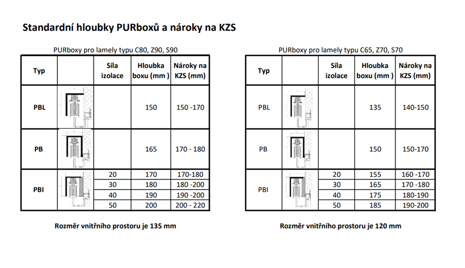 Hlavním cílem je umožnit montáž venkovních žaluzií tak, aby po zasunutí nebyly viditelné. Velikost prostoru pro žaluzie závisí na typu lamely – standardní (Z90, C80, S90) a zúžené (Z70, C65, S65). Výška prostoru se odvíjí od typu lamely a výšky okna, hloubka pak od typu lamely. V systému PURbox ISOparts je doporučená hloubka 135 mm pro standardní lamely a 120 mm pro lamely zúžené. Tyto hodnoty jsou doporučené, ale lze je upravit podle konkrétní situace.